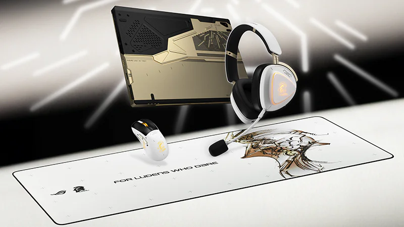 - Mousepad ROG Scabbard II XXL-KJP: Mousepad besar dengan permukaan tahan air, minyak, dan debu yang menampilkan ilustrasi Ludens dengan gaya sketsa tangan karya Yoji Shinkawa.